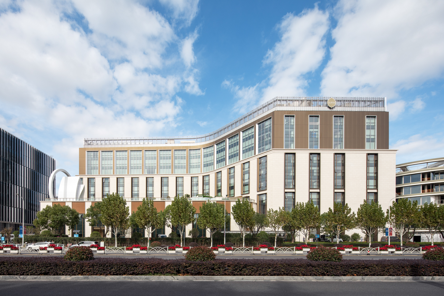 旅馆修建形态柔和、线条流通,,,,,,以“流动的江南”为设计诗学,,,,,,将古板屋檐、廊道、水景与现代玻璃、金属材质融会。。。。。。。。立面如行书般流通,,,,,,空间如画卷般睁开,,,,,,鳞次栉比形成富有节奏感的体量关系,,,,,,质感“微光一过,,,,,,粼粼皱碧”。。。。。。。。